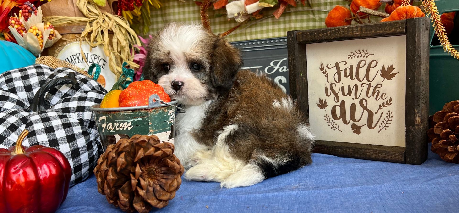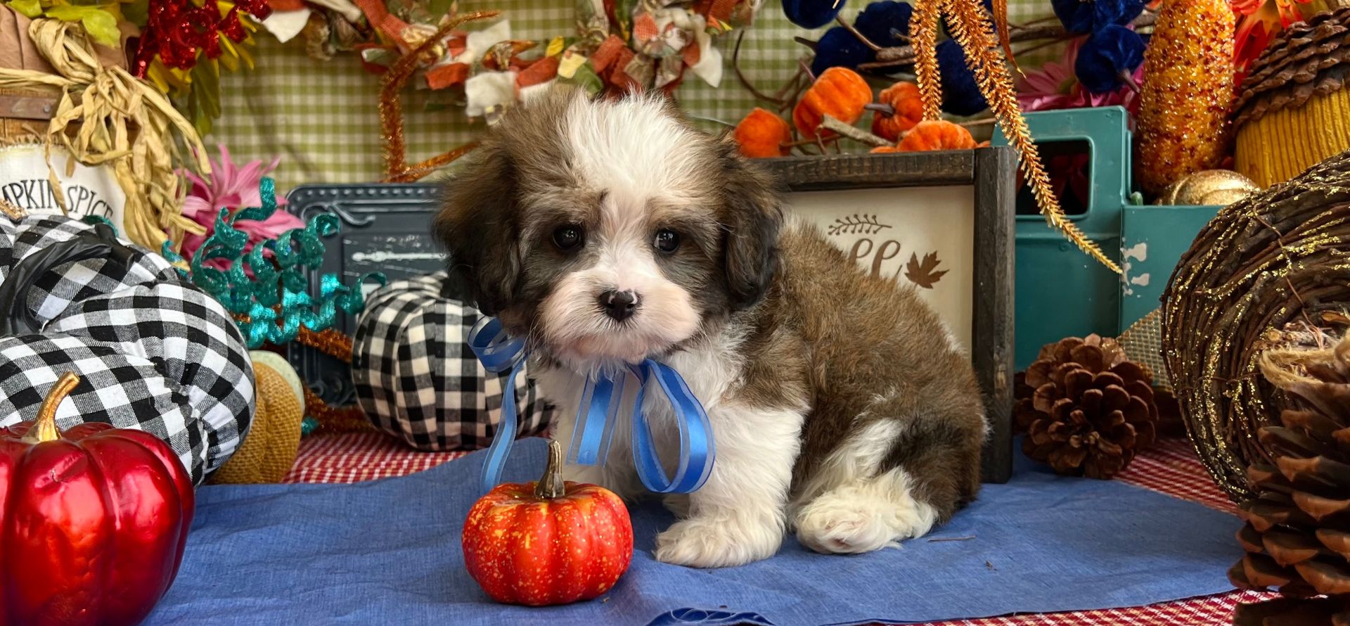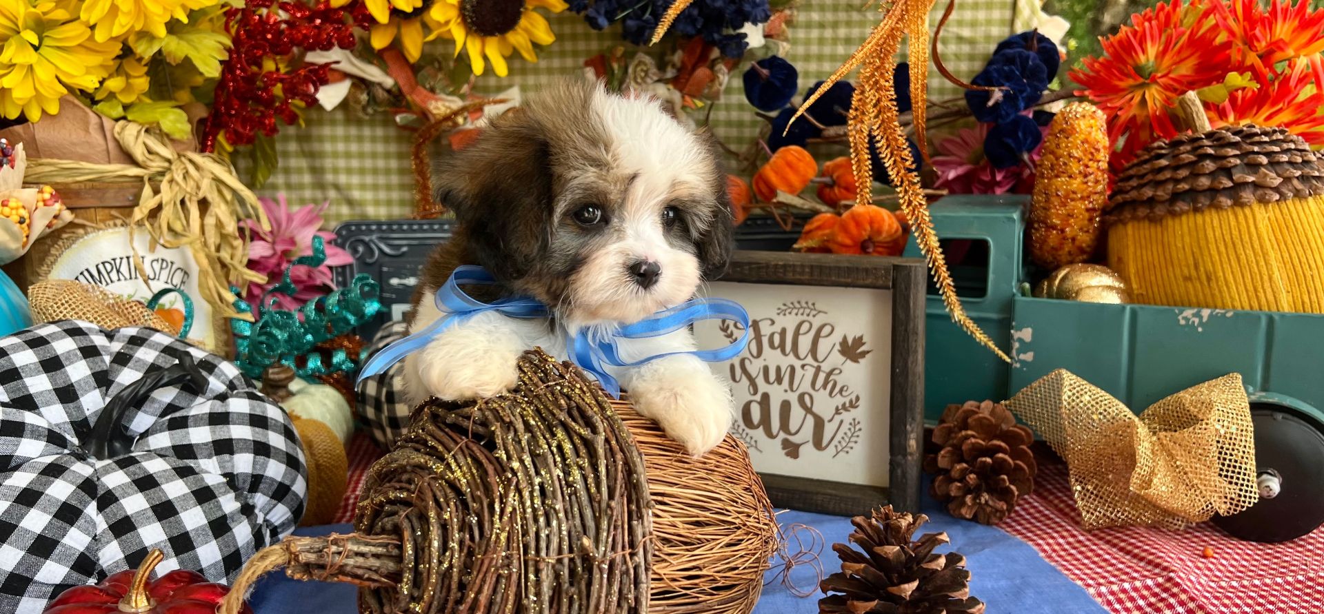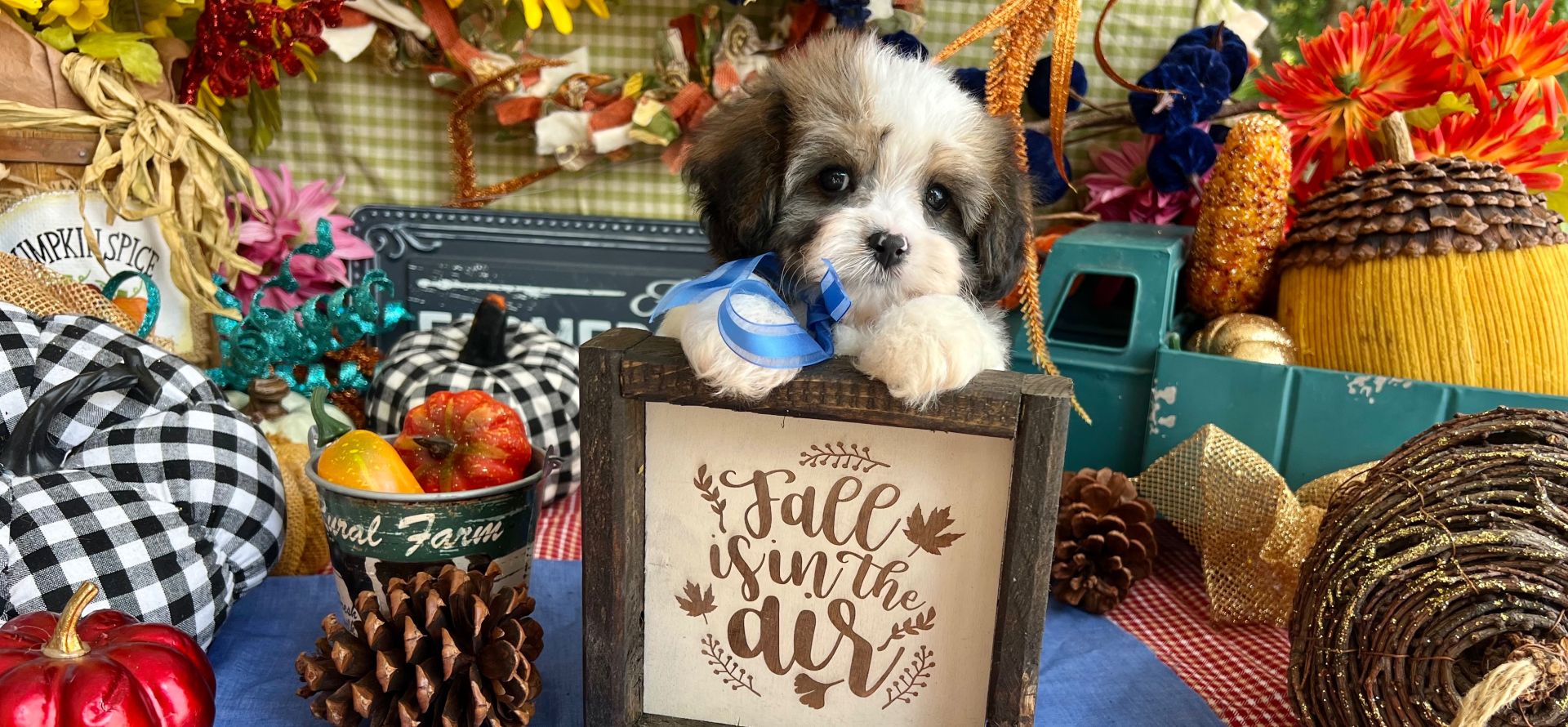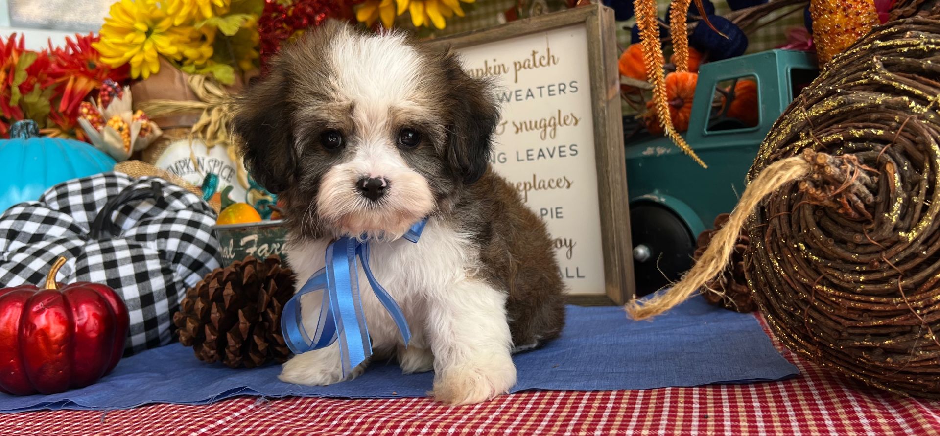 This handsome tri-colored Cavachon has a soft, fluffy, beautifully textured coat that makes him an instant standout. His joyful spirit lights up every room, and his ever-wagging tail and bright, expressive eyes bring happiness to everyone he meets. And that little button nose? It’s still finishing its journey to a full, rich black — a sweet reminder that he’s still a baby, growing more handsome each day. Whether he’s playfully entertaining himself with a favorite toy or nestled quietly by your side, Wiley’s gentle nature and affectionate heart shine through in everything he does.