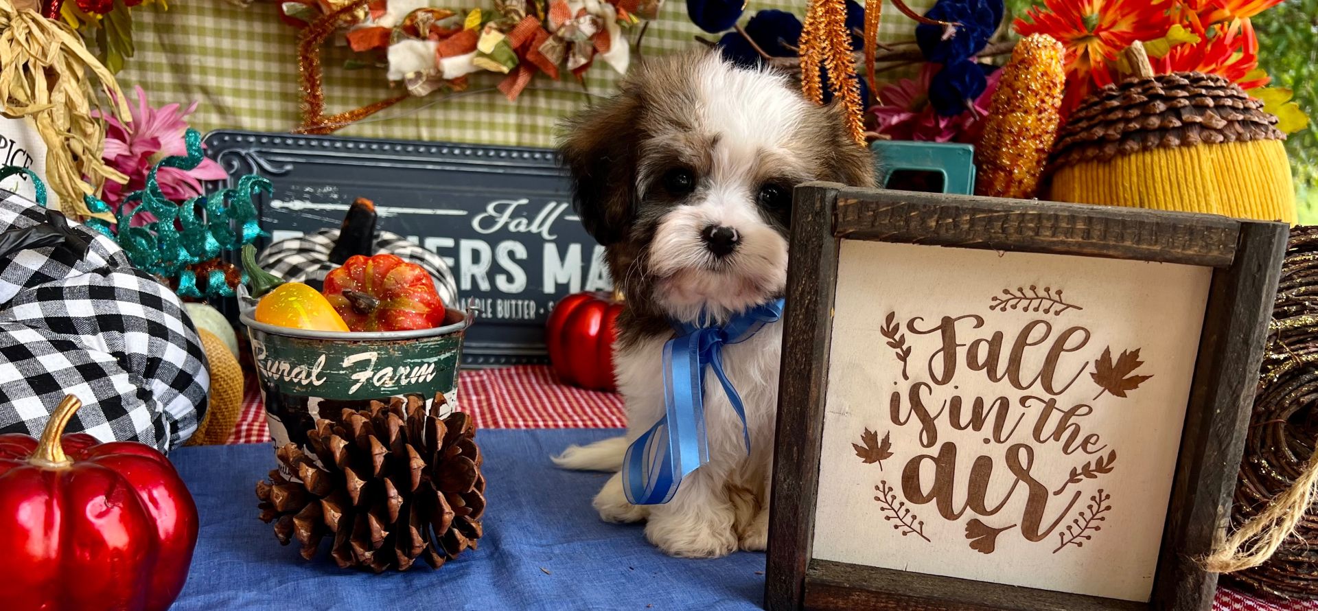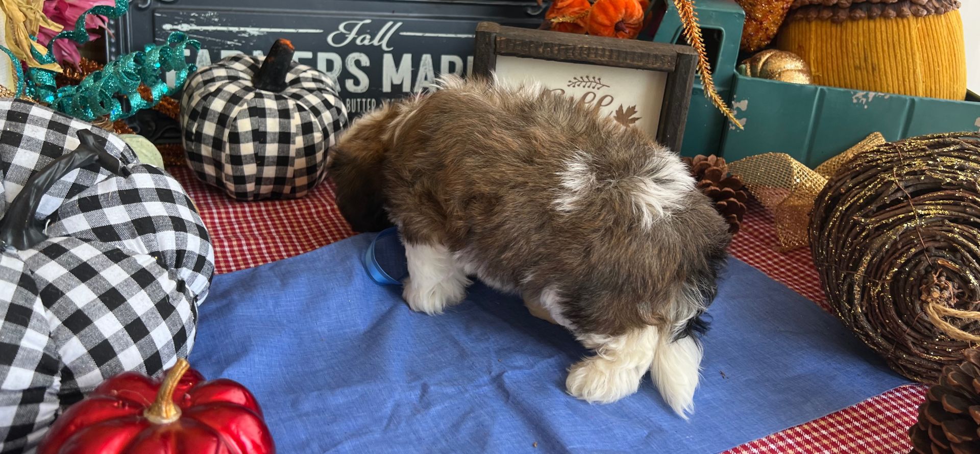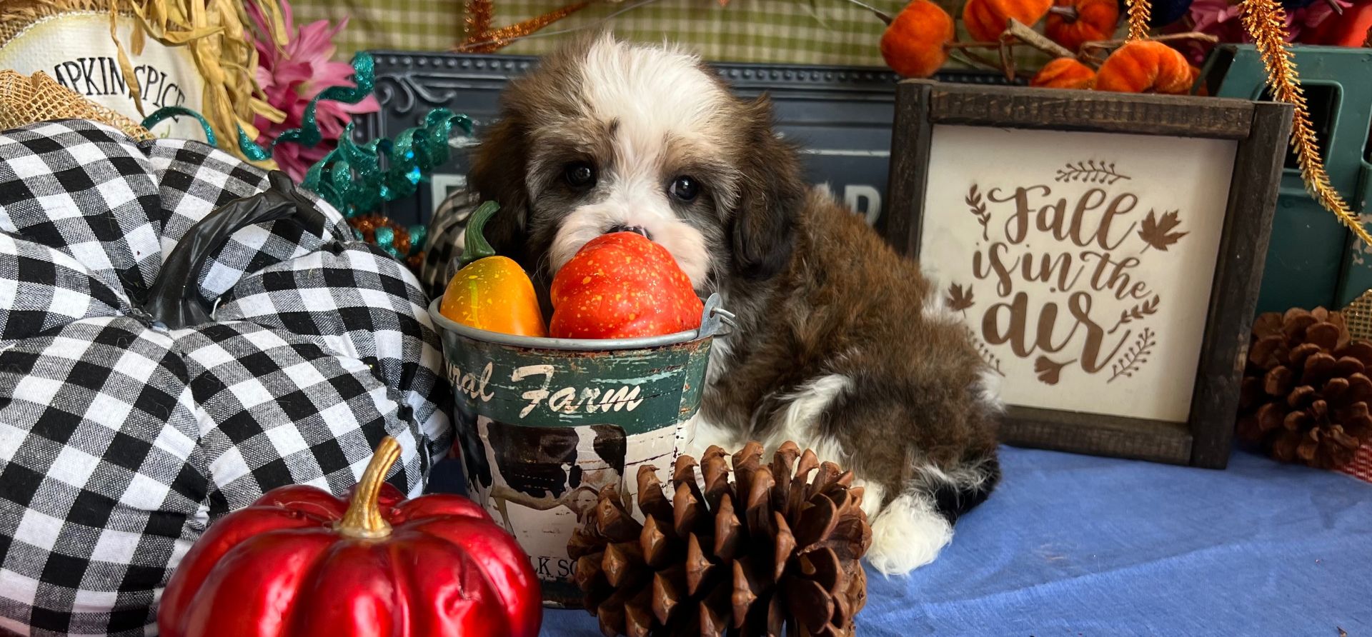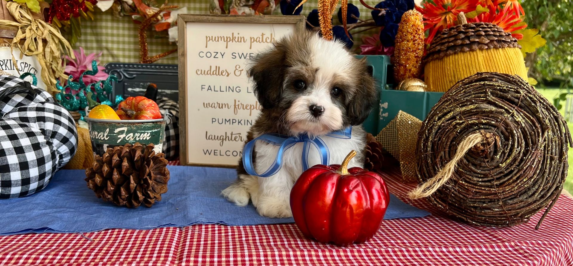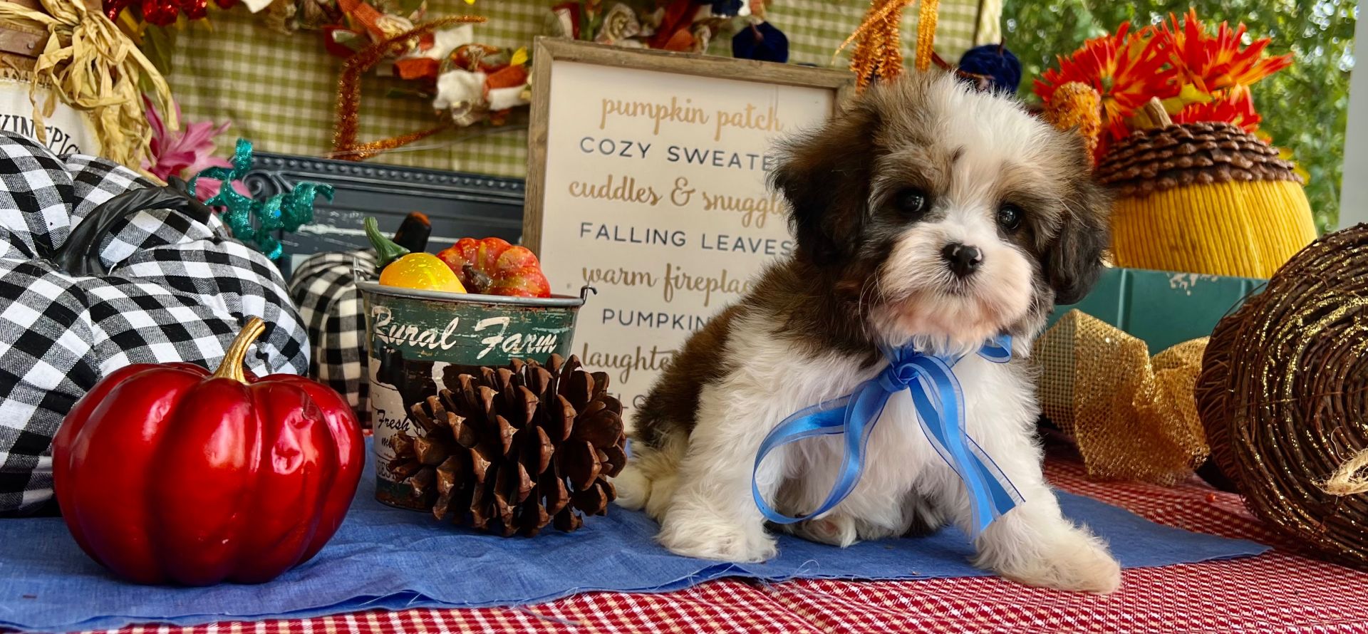 This handsome tri-colored Cavachon has a soft, fluffy, beautifully textured coat that makes him an instant standout. His joyful spirit lights up every room, and his ever-wagging tail and bright, expressive eyes bring happiness to everyone he meets. And that little button nose? It’s still finishing its journey to a full, rich black — a sweet reminder that he’s still a baby, growing more handsome each day. Whether he’s playfully entertaining himself with a favorite toy or nestled quietly by your side, Wiley’s gentle nature and affectionate heart shine through in everything he does.