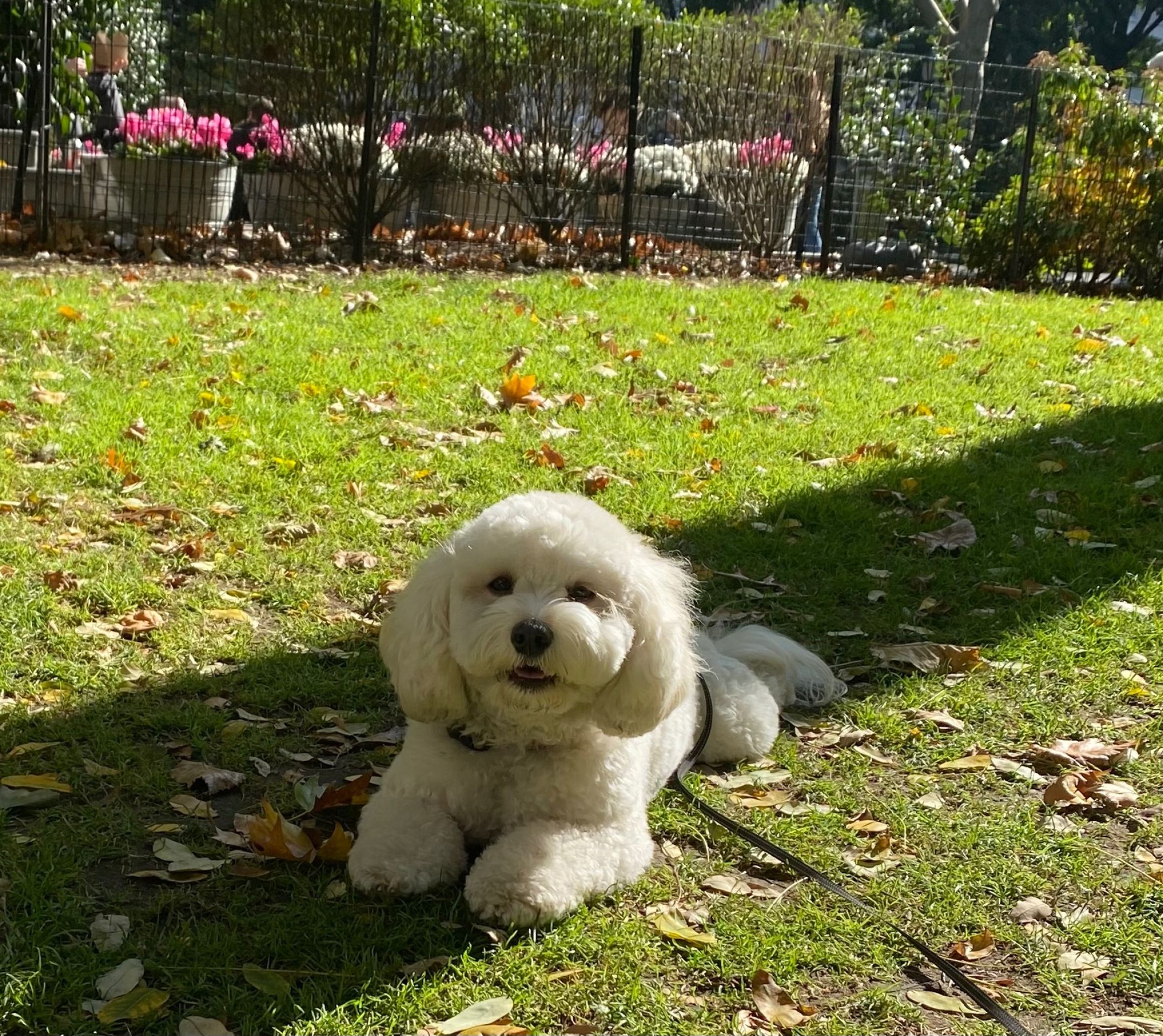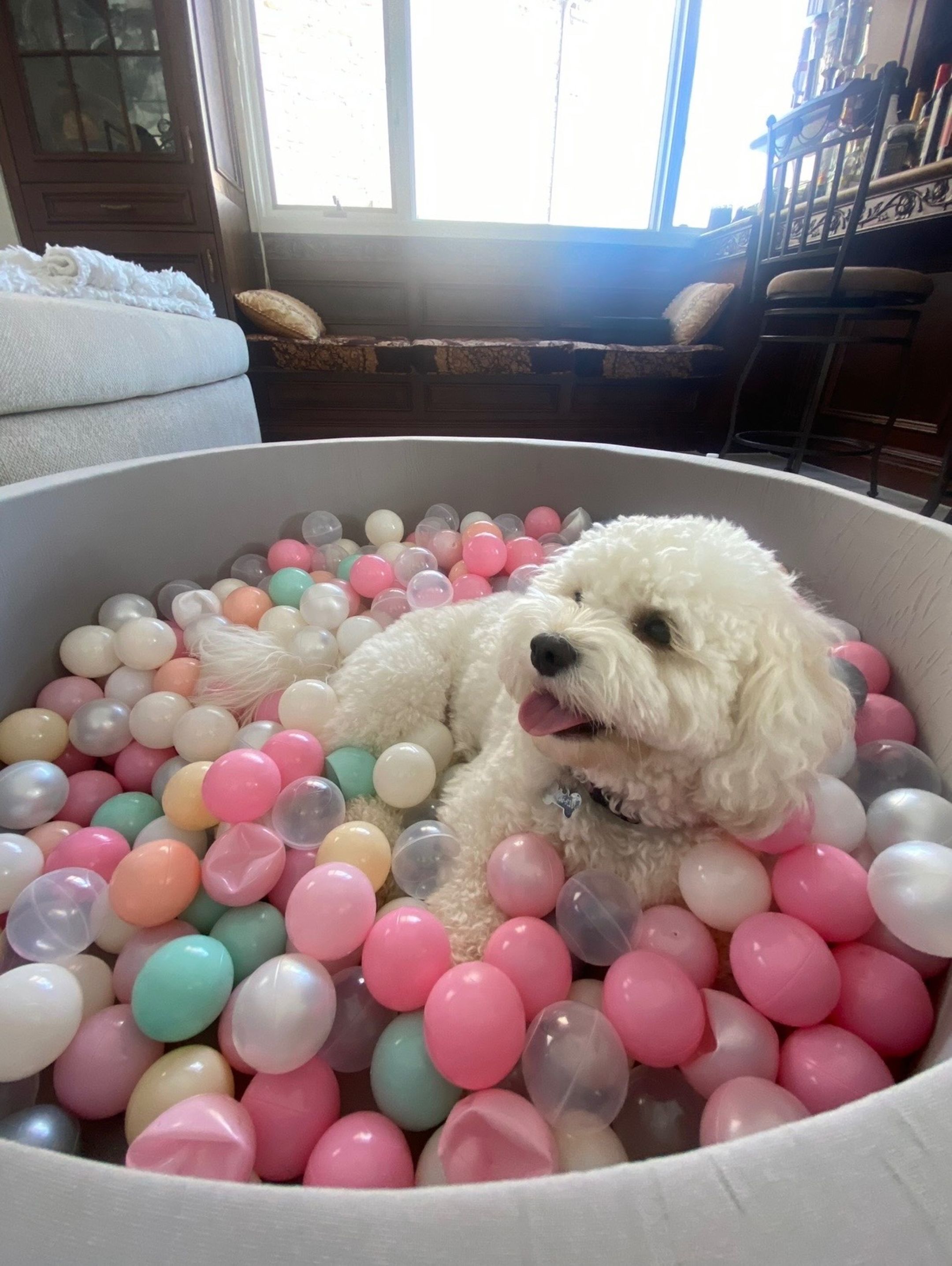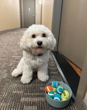 Sadie loves running around our apartment hallway with her best friend, Iris, a 5‑year‑old toy poodle who lives just next door. We throw small tennis balls down the hall, and all of our neighbors love to watch them play. We even have a whole “ball in the hall” game — a very strategic, carefully thought‑out sport that can only truly be understood if witnessed in person.