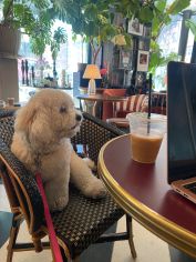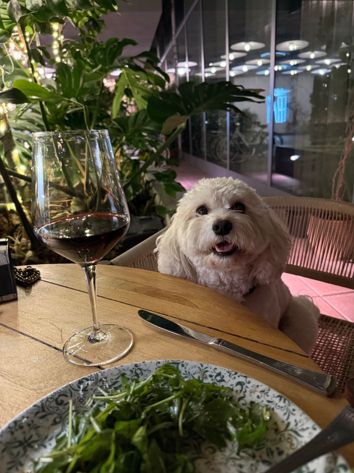 I also love bringing her to restaurants. She joins me for brunch with friends, quiet work sessions at coffee shops, and even dinners just the two of us. She is the most well‑behaved girl — that is, until she sees the waiter approaching with the bread basket.